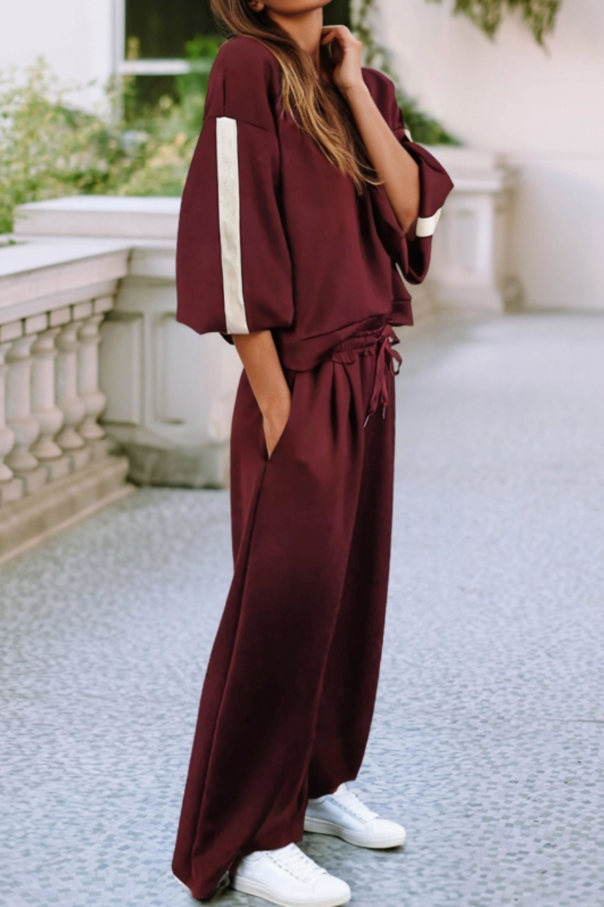 Lounge top and pants in a burgundy color with a white stripe on the sleeves. The drawstring pants with pockets make it the perfect lounge or travel set. Style them together or separately.