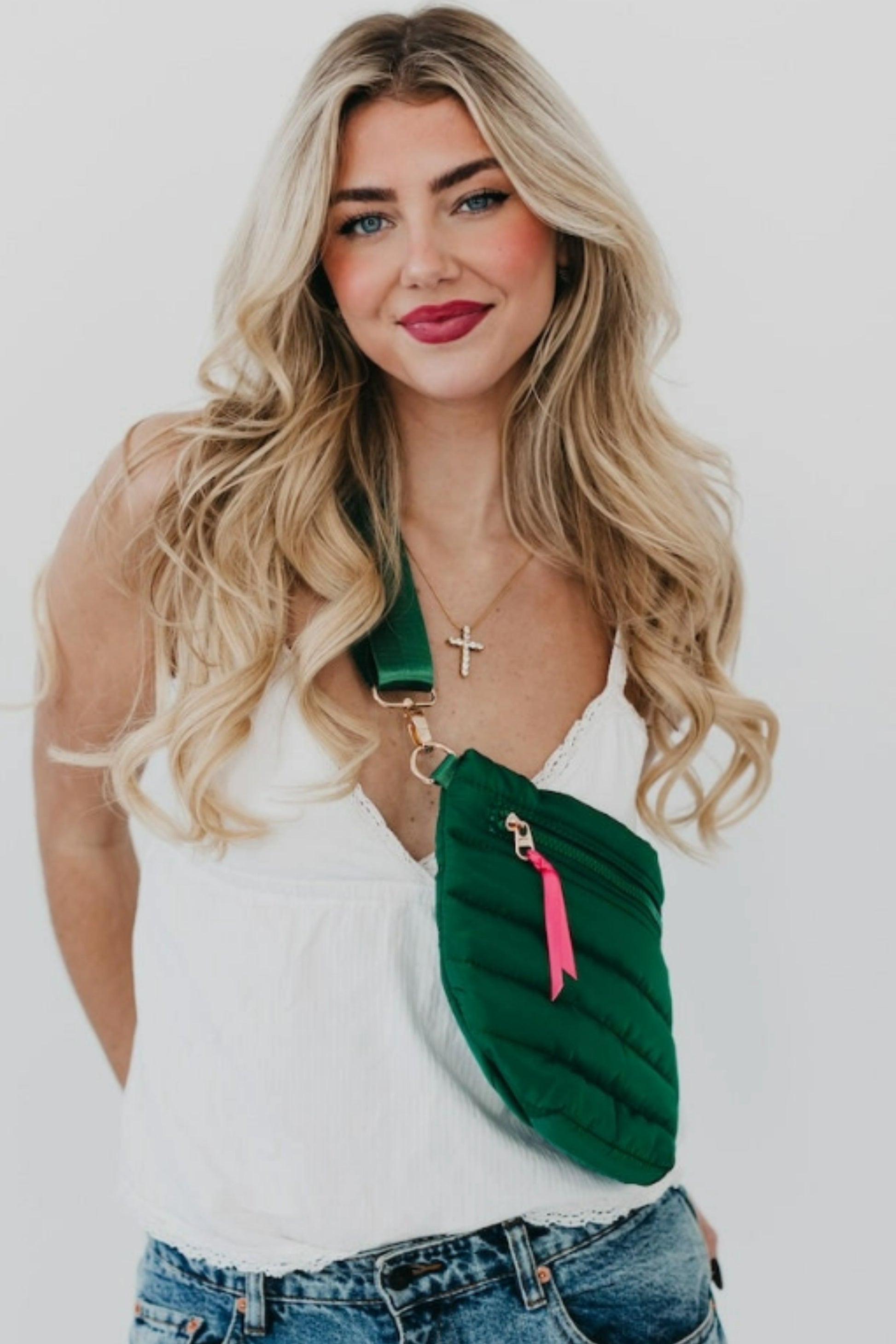 Jolie Puffer Crossbody Bum Bag is a quilted belt bag that can be worn as a belt bag/fanny pack, crossbody bag, or shoulder bag. Featuring a unique half moon shape in a quilted puffer poly fabric. Gold hardware with a fun ribbon accent on the zipper finish off this popular design.
